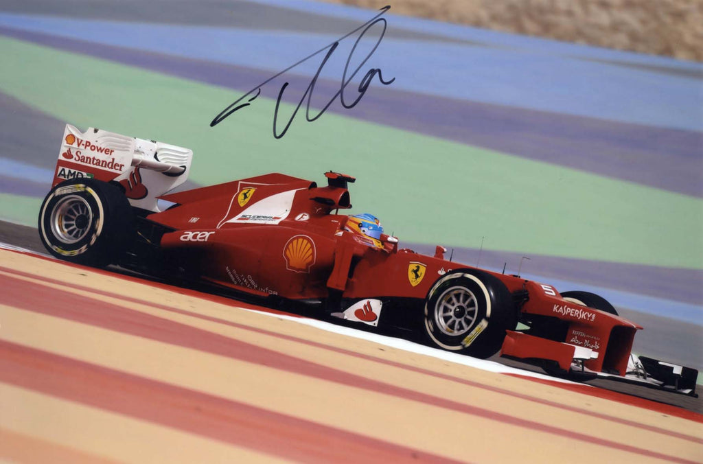 IP signed photograph, shows Fernando Alonso in a racing scene (Ferrari 2012), 12 x 8 inch, signed in black felt tip, obtained In-Person, in very fine condition.