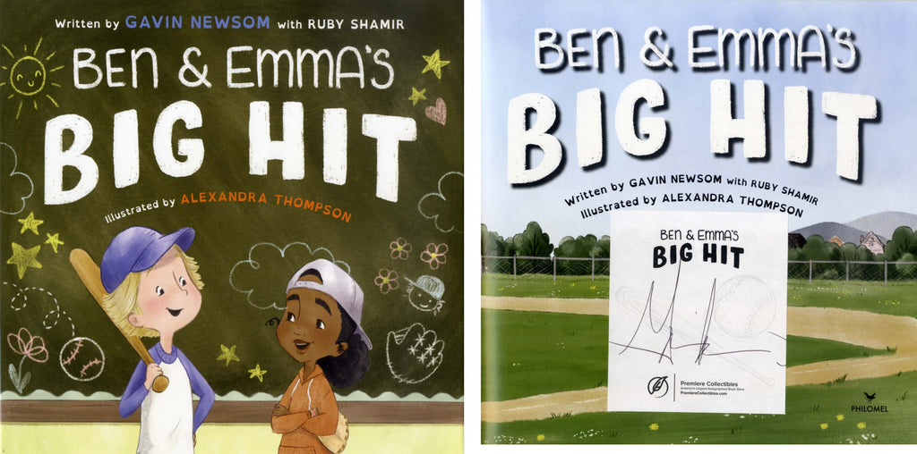 Signed book: `Ben & Emma`s - Big Hit`, published by Philomel, New York, 2021, hardcover book with dust jacket, 9,75 x 9,75 inch, 34 pages, signed on the title page (on an affixed sticker) in dark ballpoint ink "Gavin Newsom", in very fine condition.