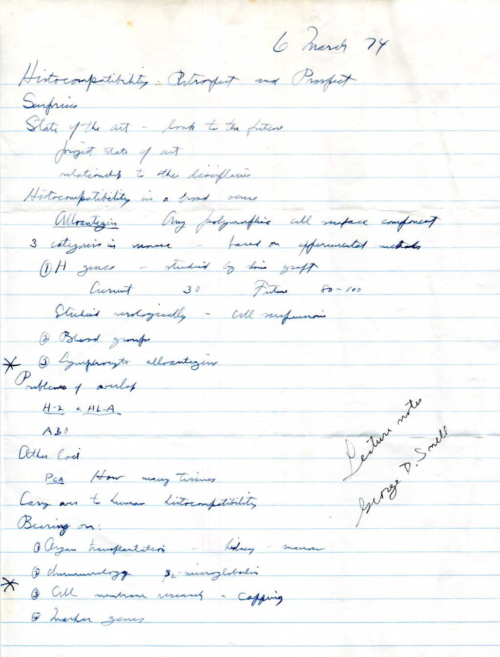 Autograph manuscript signed, one page, 8,5 x 11 inch, 6.03.1974, manuscript/lecture notes with scientific content - entitled "Histocompatibility: Retrospect and Prospect", written in blue ink & subsequently signed and inscribed in dark ink "Lecture notes - George D. Snell", with mild creases and minor soiling to the upper edge - in fine condition.