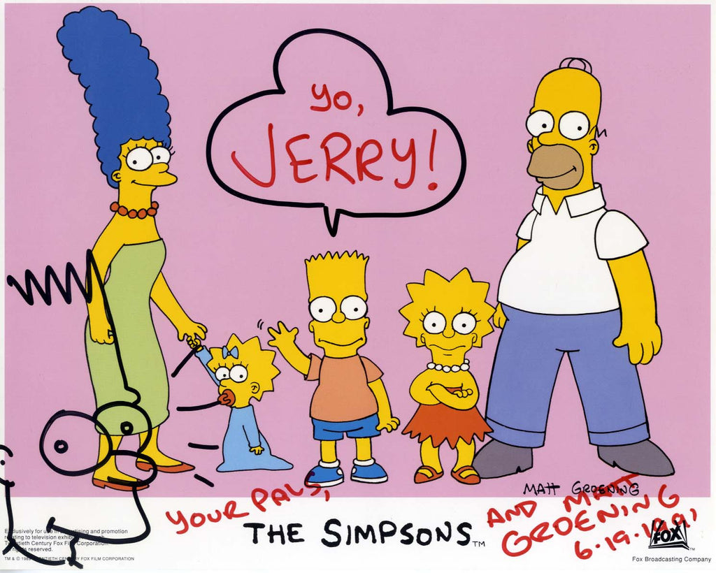 Cardstock Fox Broadcasting publicity photograph with original handdrawn sketch signed, shows `The Simpsons` in a group picture, 10 x 8 inch, signed and inscribed in red felt tip "Yo Jerry - Your pals - and Matt Groening 6.19.1991" - as well as an original sketch of a Bart in black felt tip, with a paper-clip impression to the upper left edge - in nearly very fine condition.
