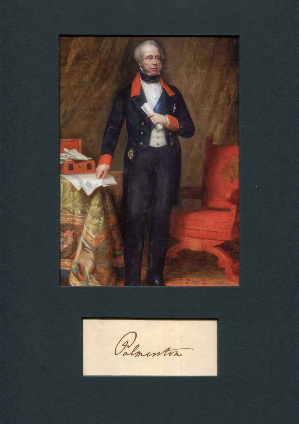 Signed album page, 4,25 x 2 inch, signed in dark ink "Palmerston", attractively mounted (removable) for fine display with a picture of Lord Palmerston (altogether 8,25 x 11,75 inch), with browning, and scattered mild signs of wear - in fine to very fine condition.
