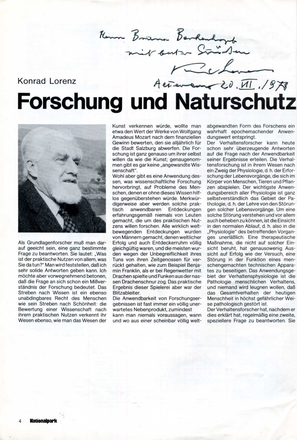 Printed scientific article signed, two pages, 8,25 x 11,5 inch, in German, article titled `Forschung und Naturschutz` by Konrad Lorenz - printed in the magazine `Nationalpark` (Vol. 18, 2/1978), signed and inscribed in dark ink "Herrn Bruno Berkenkopf - mit besten Grüßen - Konrad Lorenz - Altenberg 20.VII.1978", with very mild signs of wear - in nearly very fine condition.