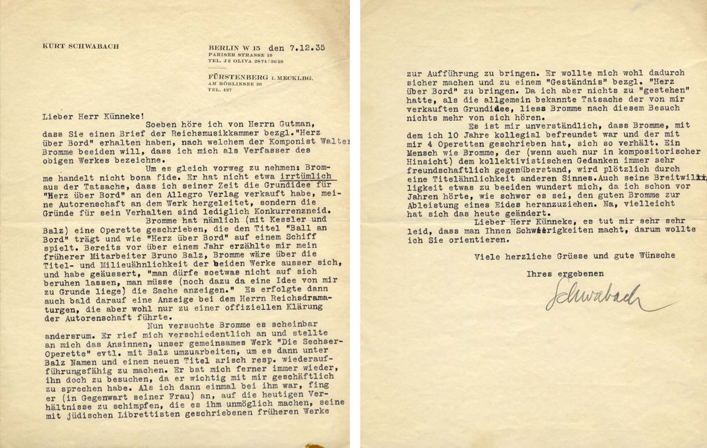 Typed letter signed, 1 1/2 pages (on two conjoined sheets), 6,75 x 8,75 inch, personal stationery, Berlin, 7.12.1935, in German, to German composer Eduard Künneke (1885-1953) - concerning the operetta `Herz über Bord` (1935), signed in pencil "Schwabach", with mild signs of wear - in fine to very fine condition.
