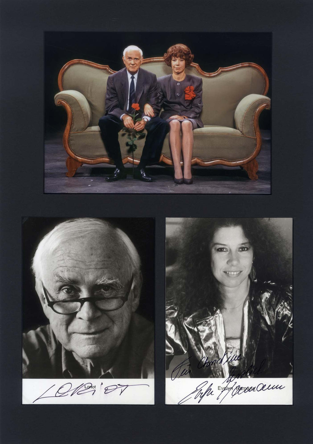 Two signed postcard photographs of Loriot and Evelyn Hamann, (both) about 4 x 6 inch, (both) signed in dark ink "Loriot" & "Für Christine herzlich - Evelyn Hamann", attractively mounted (removable) for fine display with an (unsigned) photograph (altogether 9,5 x 13,5 inch), with very mild signs of wear - in nearly very fine condition.