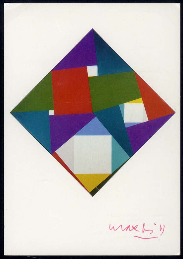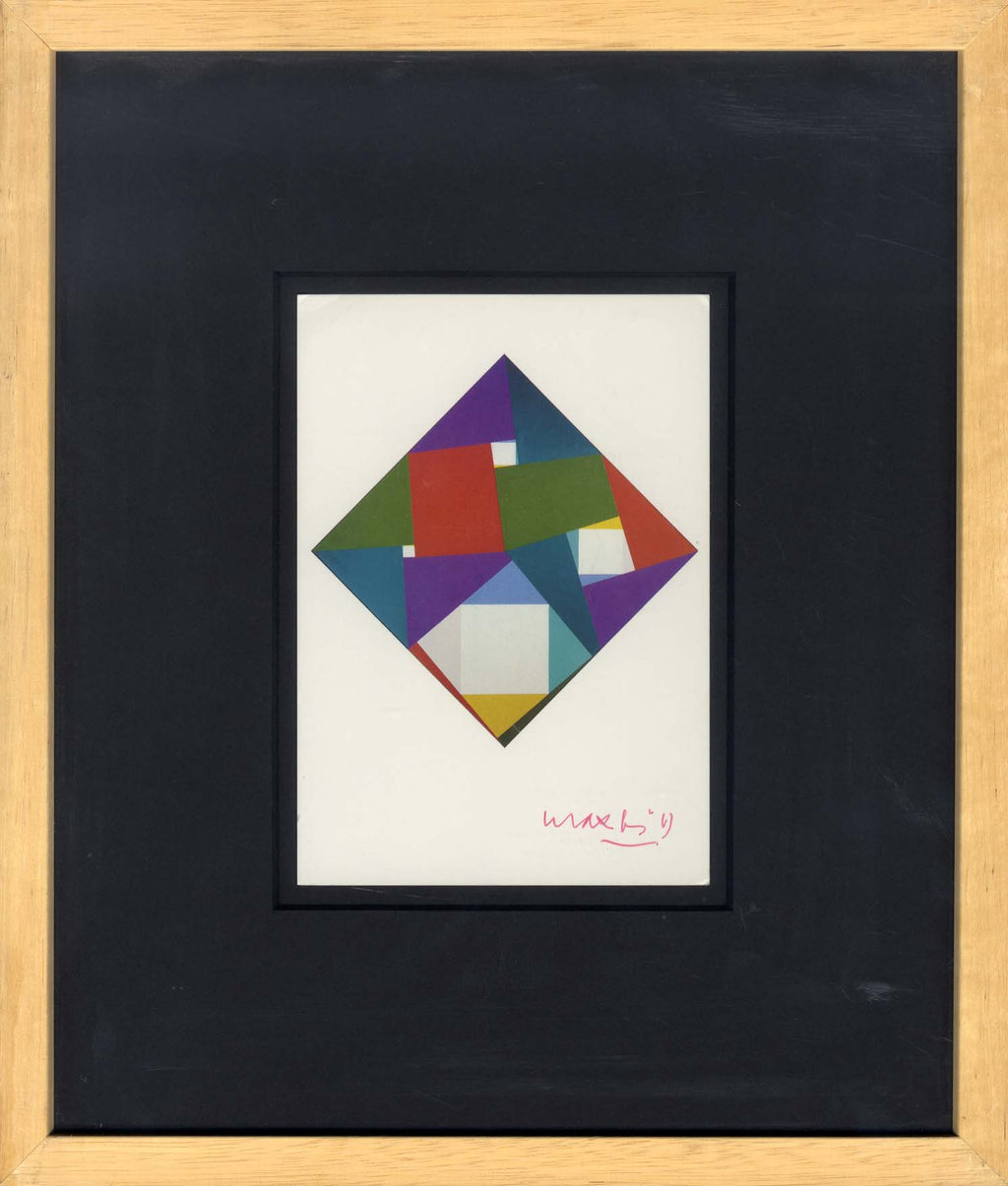 Signed art postcard, shows an artwork of Max Bill, 4 x 5,75 inch, signed by Max Bill in red ink "Max Bill", attractively mounted and framed under glass for display (altogether 10 x 11,75 inch), with very mild signs of wear - in nearly very fine condition. (On request, this piece can also be sent without the frame.)