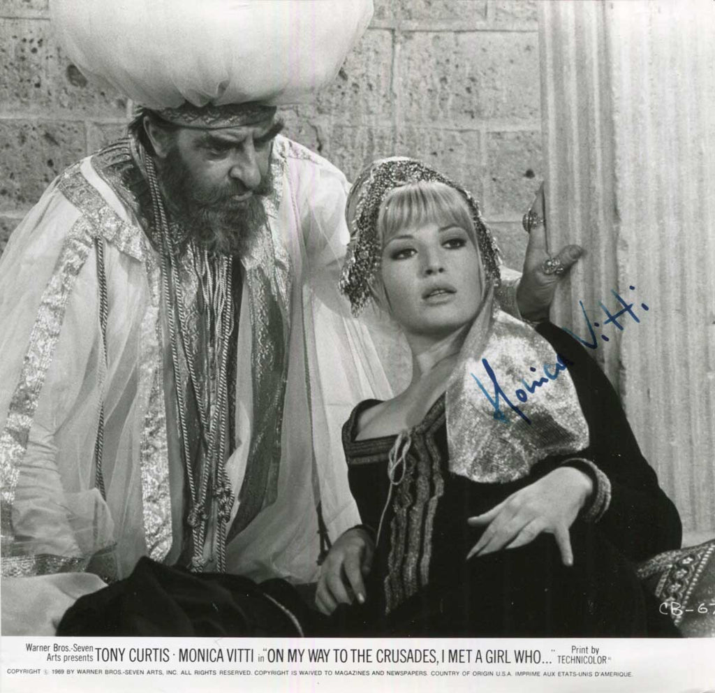 Signed vintage glossy publicity photograph, shows Monica Vitti in a film scene in `On My Way to the Crusades, I Met a Girl Who...` (1967), 8 x 7,75 inch, signed in blue ink "Monica Vitti", with slightly trimmed edges - in fine condition.