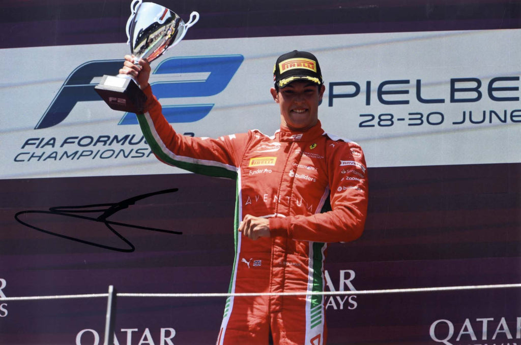 IP signed photograph, shows Oliver Bearman at an award ceremony (Ferrari), 12 x 8 inch, obtained In-Person (2024), signed in black felt tip, in very fine condition.