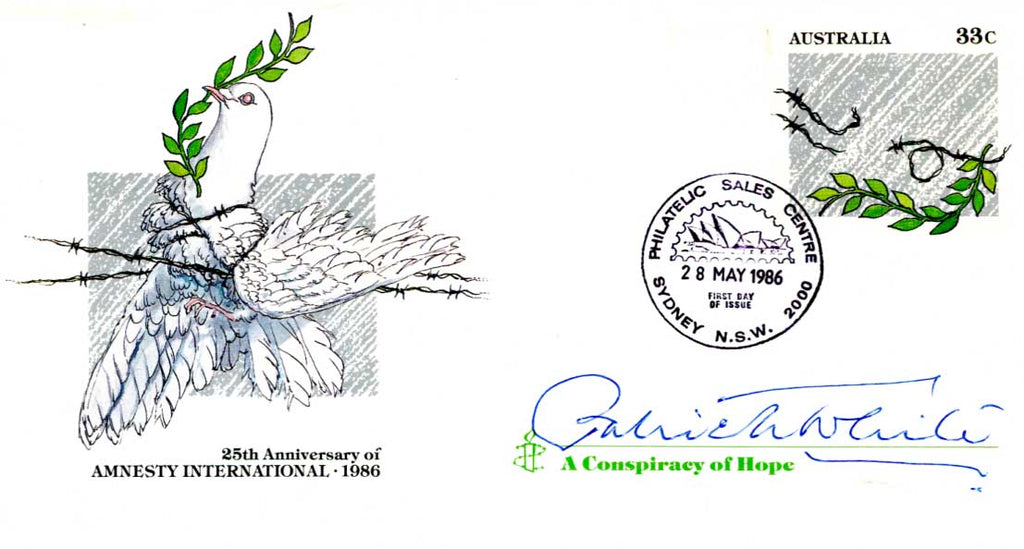 Signed First Day Cover `25th Anniversary of Amnesty International - 1986`, 7,5 x 4 inch, 28.05.1986, signed in blue ballpoint ink "Patrick White", with very mild signs of wear - in nearly very fine condition.