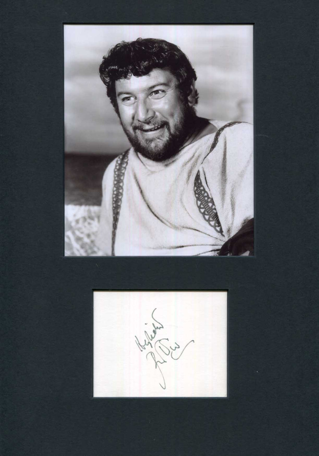Signed card, 4,75 x 3 inch, signed in dark ink "Peter Ustinov", attractively mounted (removable) for fine display with a photograph, shows Peter Ustinov in a film scene in `Spartacus` (altogether 8,25 x 11,75), with very mild signs of wear - in nearly very fine condition.