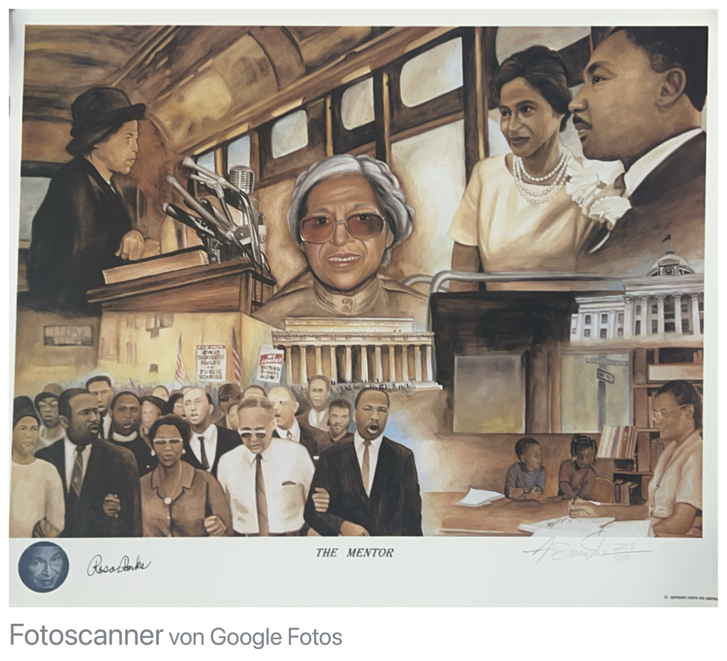 Signed beautiful colour limited edition composite lithograph of some of the most groundbreaking moments in Parks’ life - entitled ‘The Mentor,’ including standing beside Martin Luther King, Jr., numbered #203/500, 24 x 19,75 inch, signed in black ink - also signed & numbered in pencil by the artist, Anthony Douglas, rolled - otherwise in very fine condition. Embossed with a seal of the Parks Legacy and The Rosa Raymond Institute, this piece of art boasts a wonderful rendition of Parks’ and the achievements that changed a nation. Accompanied by an additional Certificate of Authenticity and a photo taken at the time of signing.