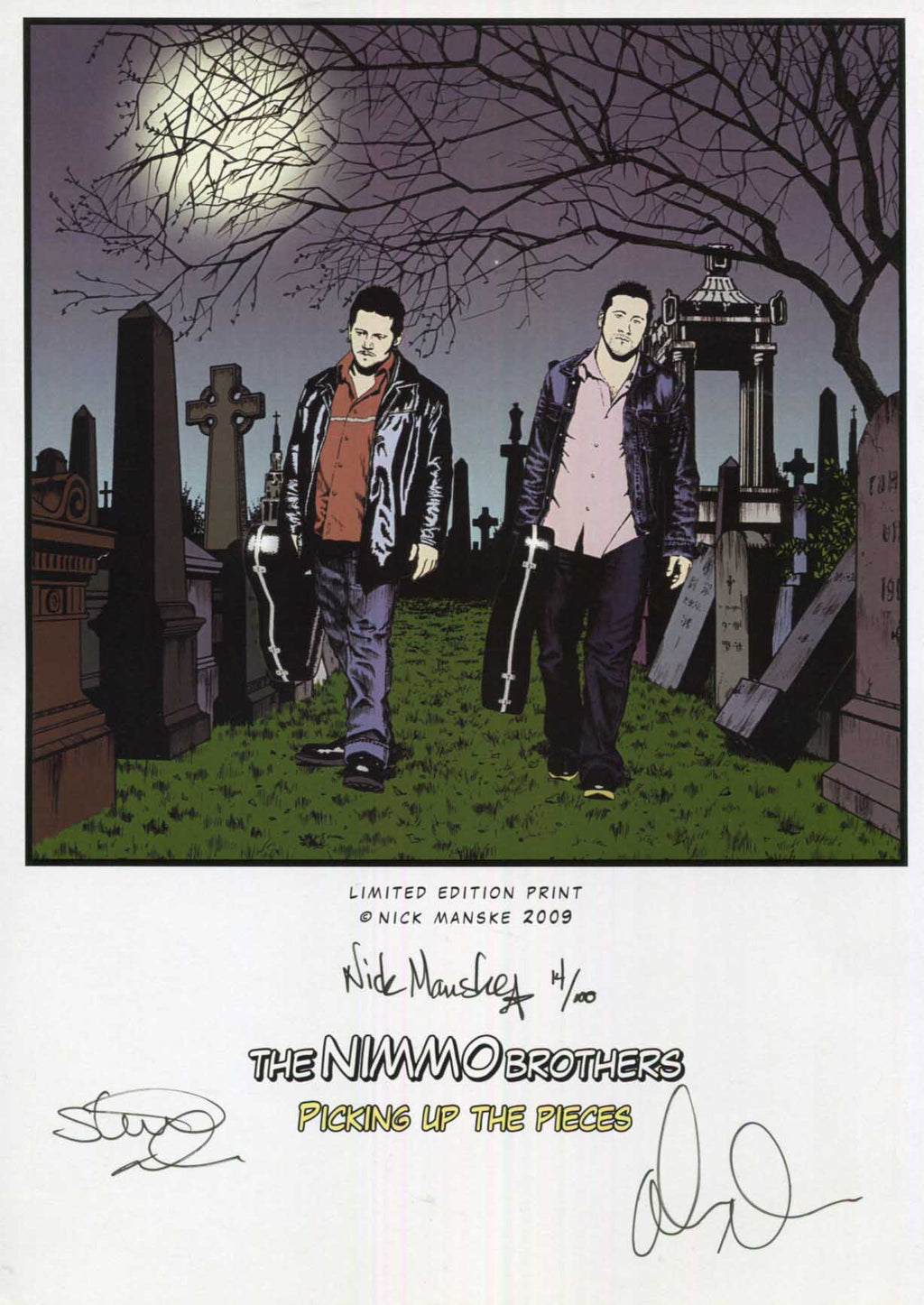 Signed limited colour print of `The Nimmo Brothers` (by Nick Manske 2009), 8,25 x 11,75 inch, signed by both in black ink - also signed by Nick Manske, in very fine condition.