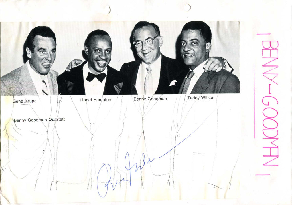 Signed vintage promotion picture, shows the Benny Goodman Quartet in a group picture, 9,5 x 7 inch - affixed on a slightly larger sheet, signed by Benny Goodman in blue ink "Errol Garner", with mild creases and sheet perforated - in fine condition.