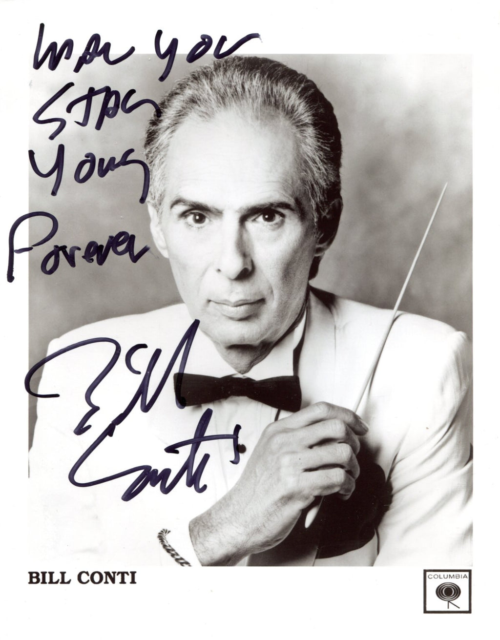 Signed publicity photograph, shows Bill Conti in a beautiful head and shoulders pose, 8 x 10,25 inch, signed and inscribed in black felt tip "With You stay yours forever - Bill Conti", in very fine condition.