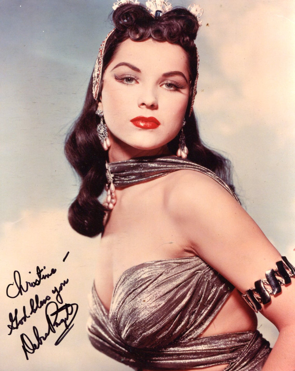 Signed photograph, shows Debra Paget in a chest-up pose, 8 x 10 inch, signed and inscribed in black felt tip "Christine - God bless you - Debra Paget", in very fine condition.