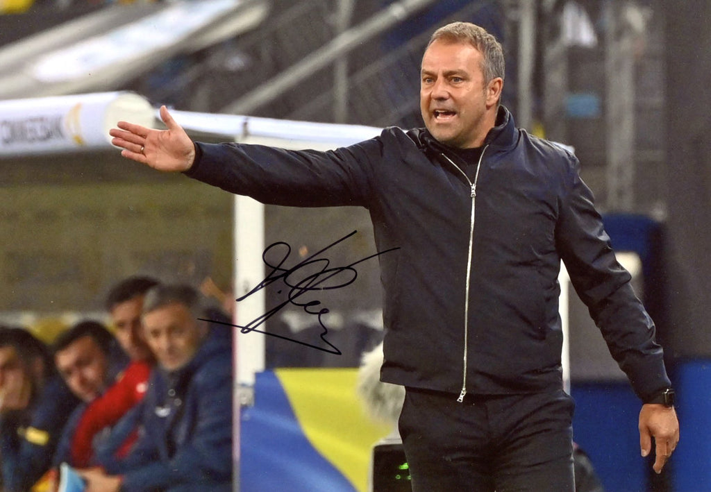 IP signed photograph, shows Hansi Flick as football manager, 12 x 8 inch, obtained In-Person in Leipzig (24.09.2022), signed in black felt tip, in very fine condition.