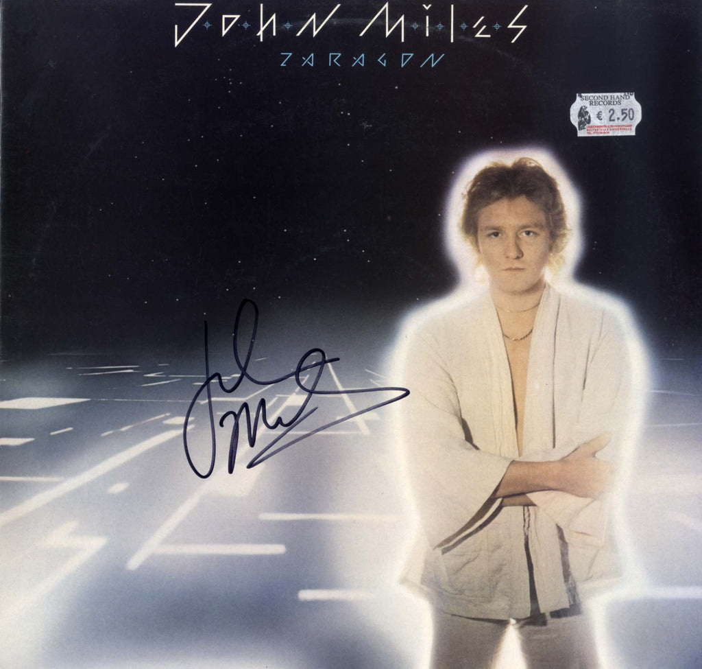 IP signed vinyl record cover `John Miles - Zaragon`, 12,25 x 12,25 inch, signed by John Miles in black felt tip, obtained In-Person, with very mild signs of wear - in nearly very fine condition. Accompanied by the record.