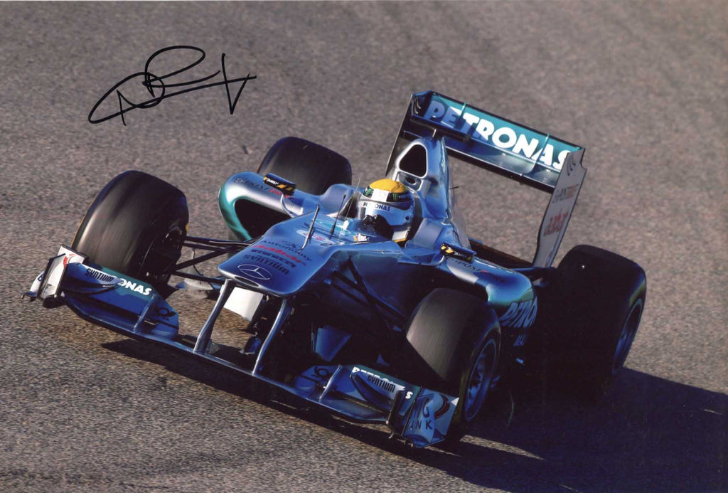 IP signed photograph, shows Nico Rosberg in a racing scene (Mercedes 2011), 12 x 8 inch, signed in black felt tip, obtained In-Person, in very fine condition.
