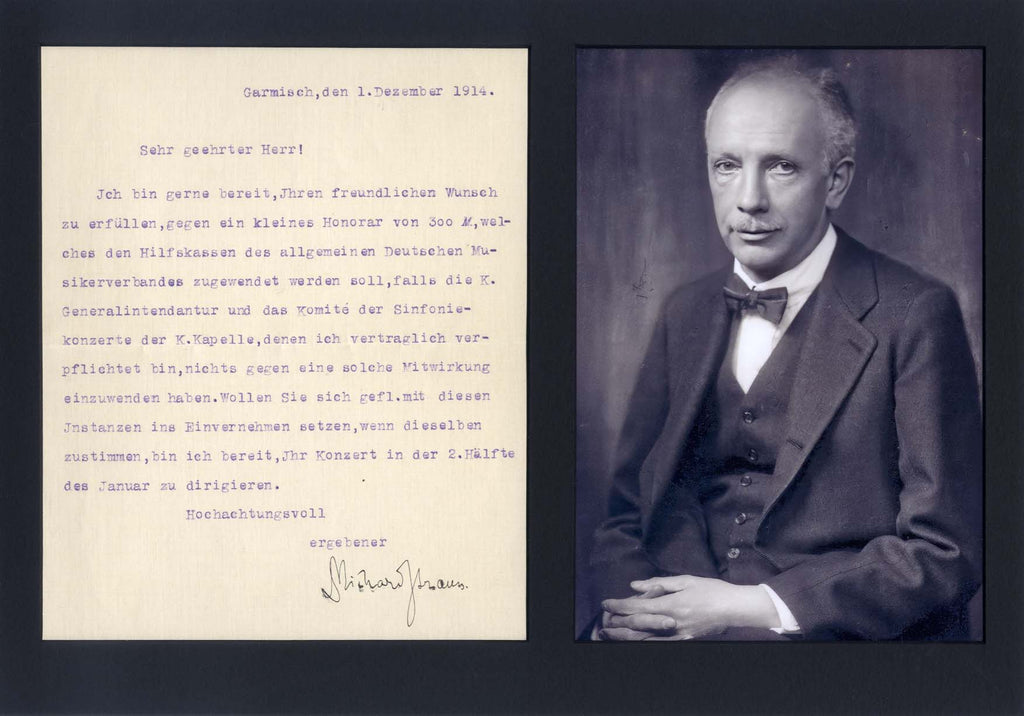 Typed letter signed, one page, 5,75 x 7,5 inch, Garmisch, 1.12.1914*, in German, to an unnamed gentleman - concerning a donation for the General German Musicians` Association and conducting a concert, signed in dark ink "Richard Strauss", attractively mounted (removable) for fine display with a photograph of Richard Strauss (altogether 11,75 x 8,25 inch), with very mild signs of wear - in nearly very fine condition.