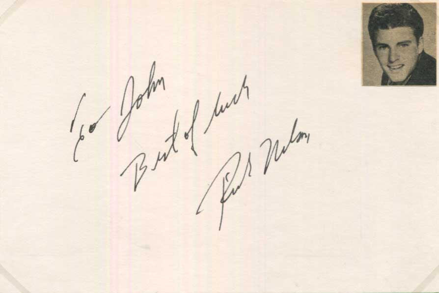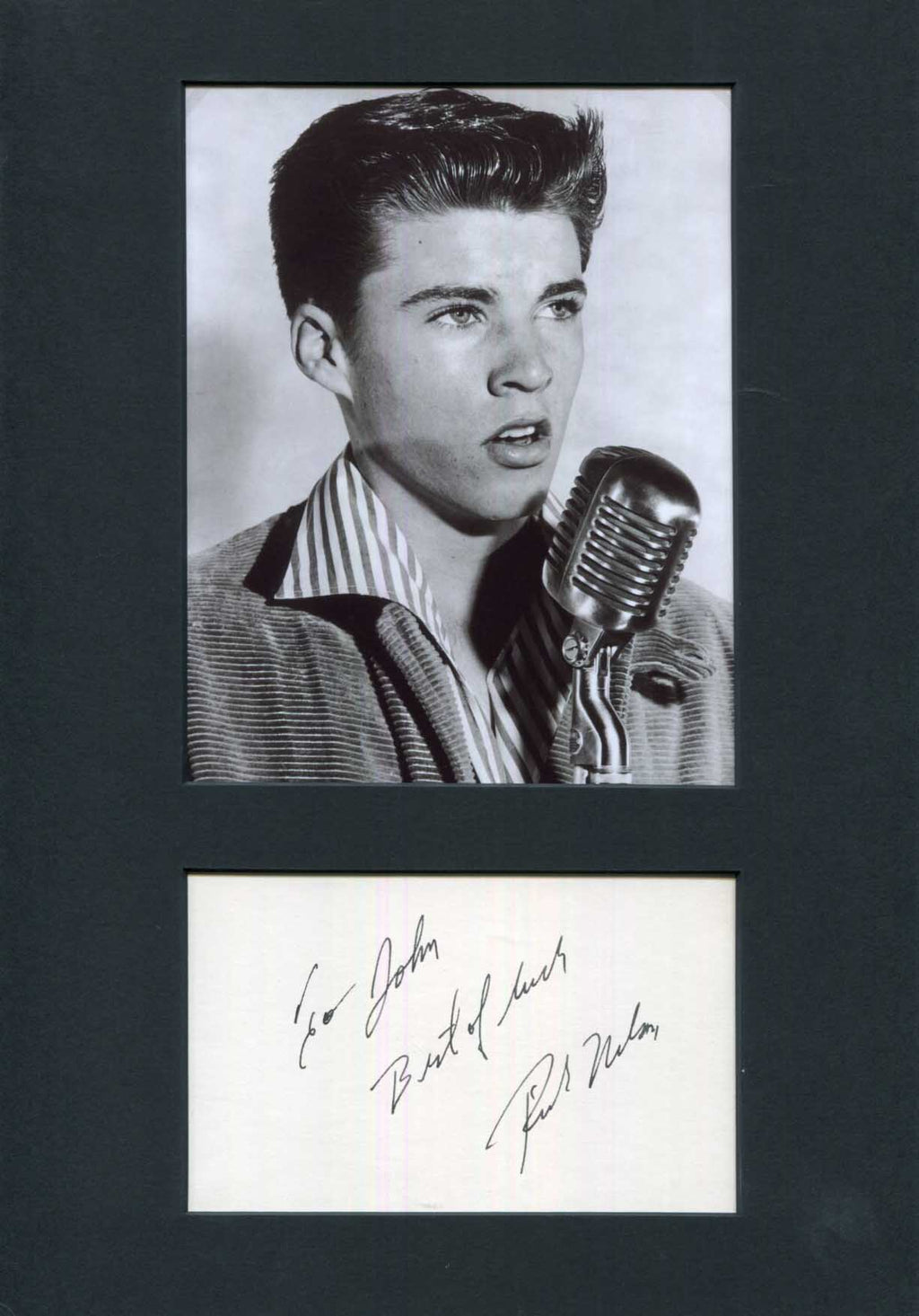 Signed card - with an affixed magazine picture to the upper right corner (covered by the passepartout), 6 x 4 inch, signed and inscribed in black ink "To John - Best of luck - Rick Nelson", attractively mounted (removable) for fine display with a photograph, shows Nelson as singer (altogether 8,25 x 11,75 inch), with very mild signs of wear - in nearly very fine condition.