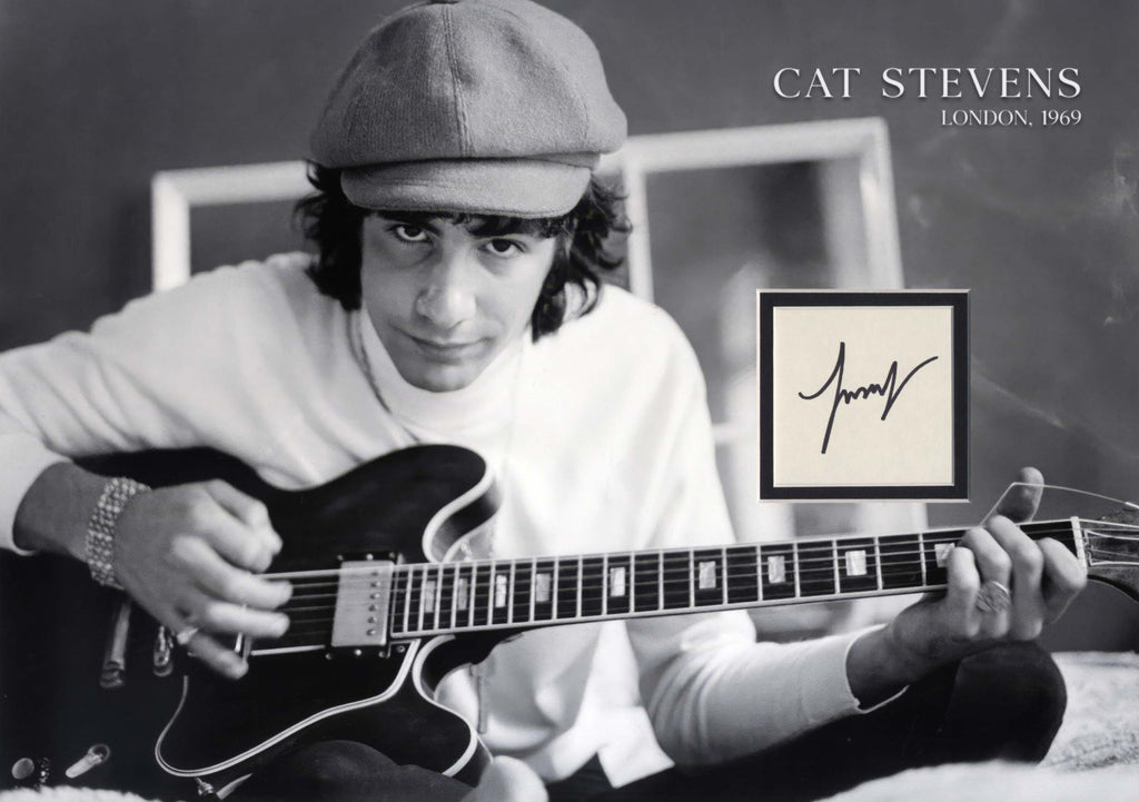 Signed book page `On the Road to Findout` (covered by the mount), 5 x 6,5 inch, signed in black felt tip "Yusuf", attractively affixed for fine display to an exclusively designed custom-matting (altogether 16,5 x 11,75 inch), with slightly trimmed edges - in nearly very fine condition. Accompanied by an additional `AutographCOA` certificate of authenticity.