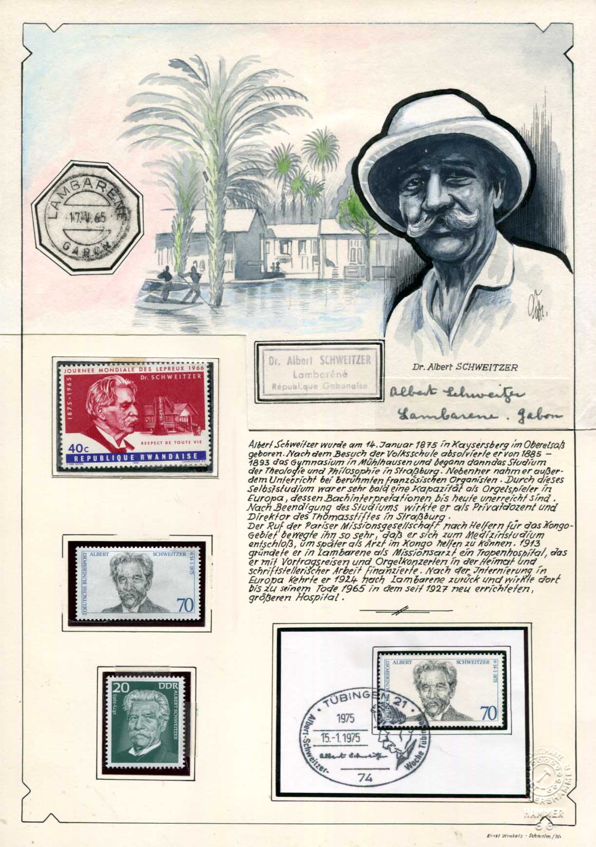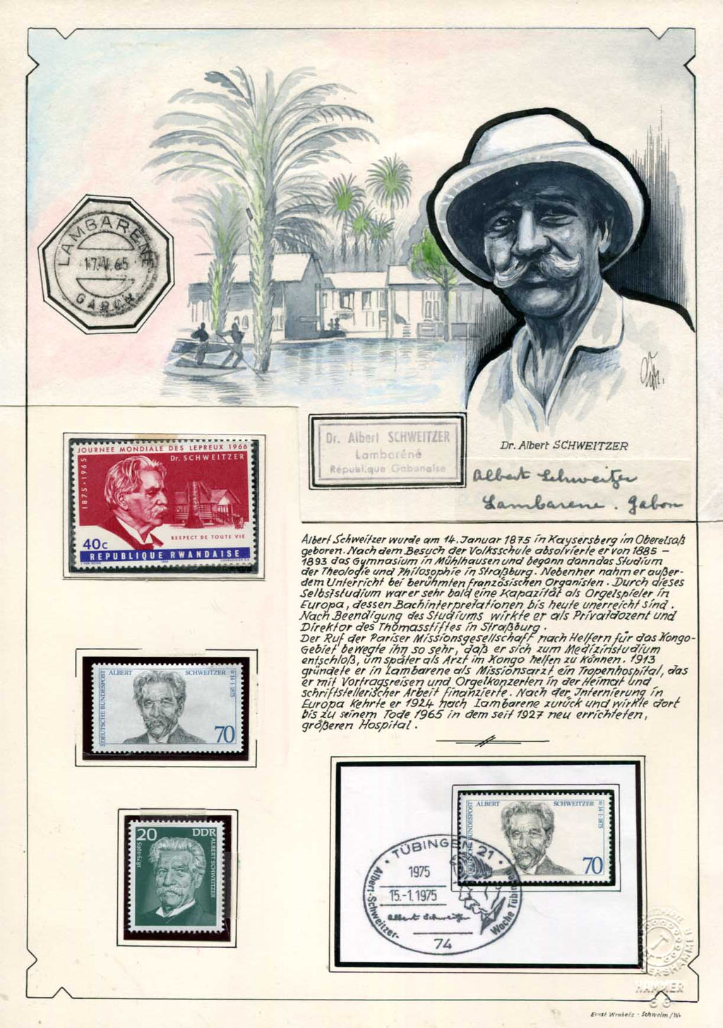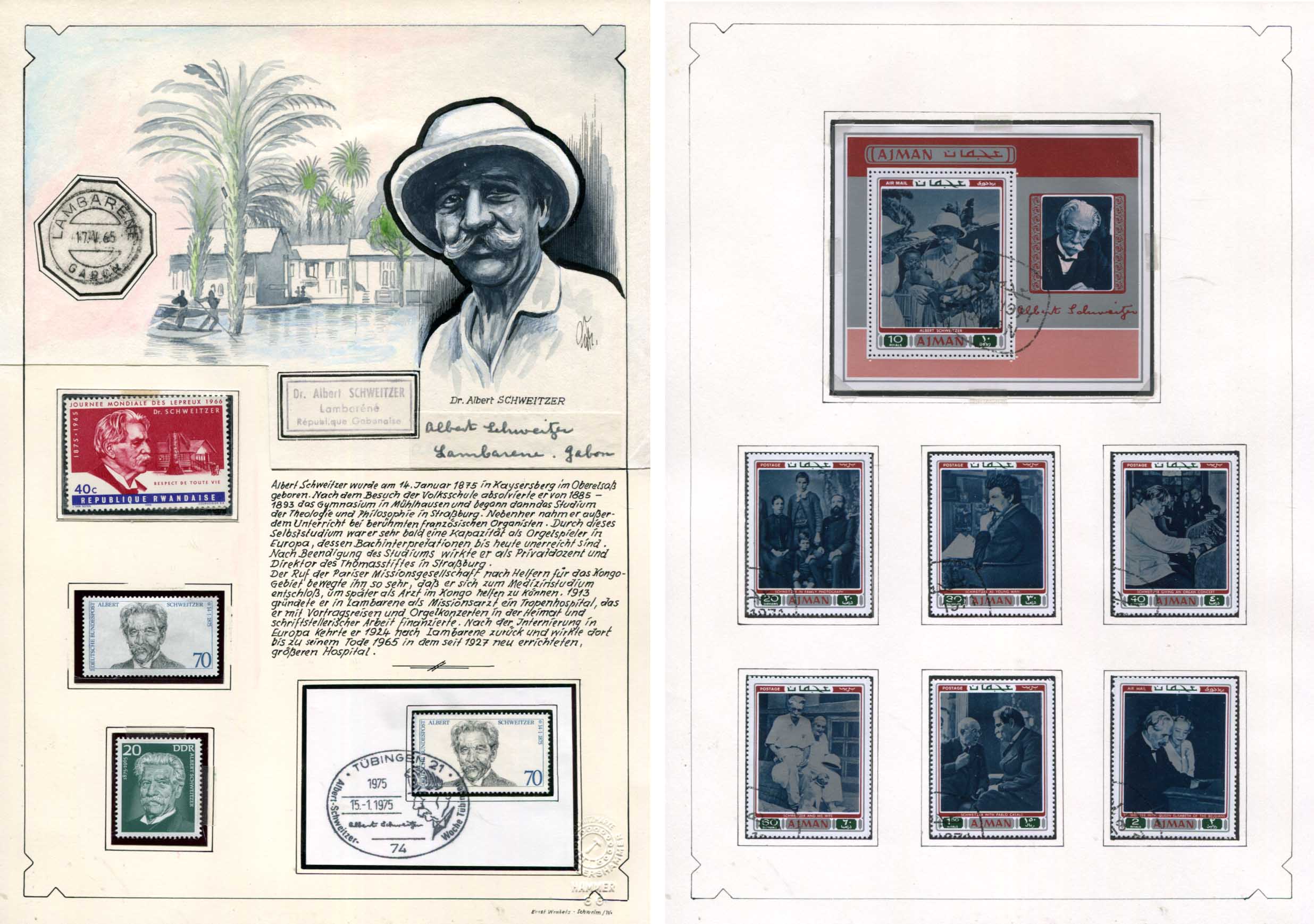 Printed card - with 4 attached special stamps of Albert Schweitzer - signed, shows a picture and a biography of Albert Schweitzer, 8,25 x 11,5 inch, signed and inscribed in blue ink "Albert Schweitzer - Lambarene. Gabon", with very mild signs of wear - in nearly very fine condition. Accompanied by 7 additional special stamps of Albert Schweitzer.
