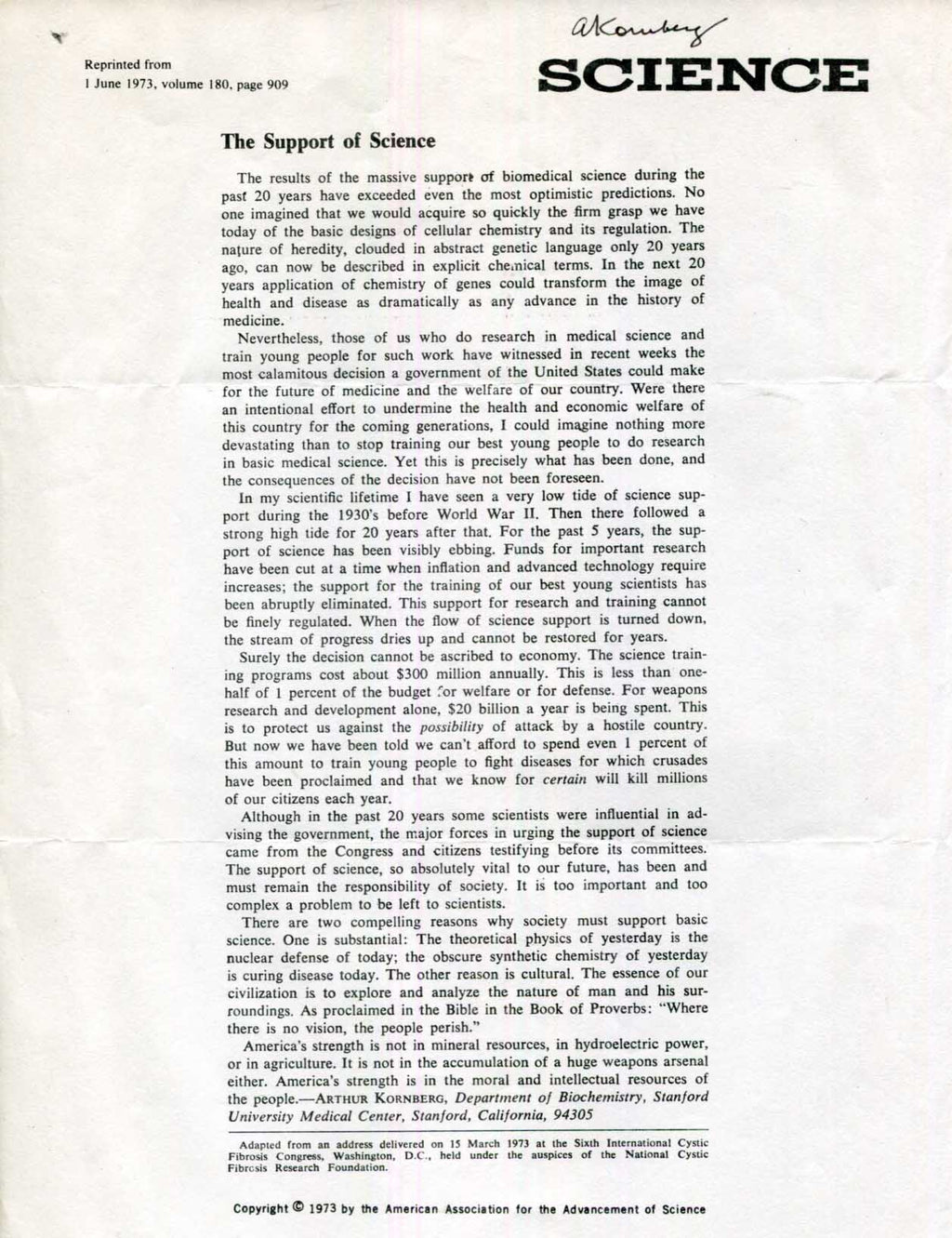 Printed scientific article signed, one page, 8,5 x 11 inch, scientific article entitled `The Support of Science` by Arthur Kornberg - reprint from `Science` (June 1, 1973, Vol. 180), signed in dark ink "A. Kornberg", with mild signs of wear - in fine to very fine condition.