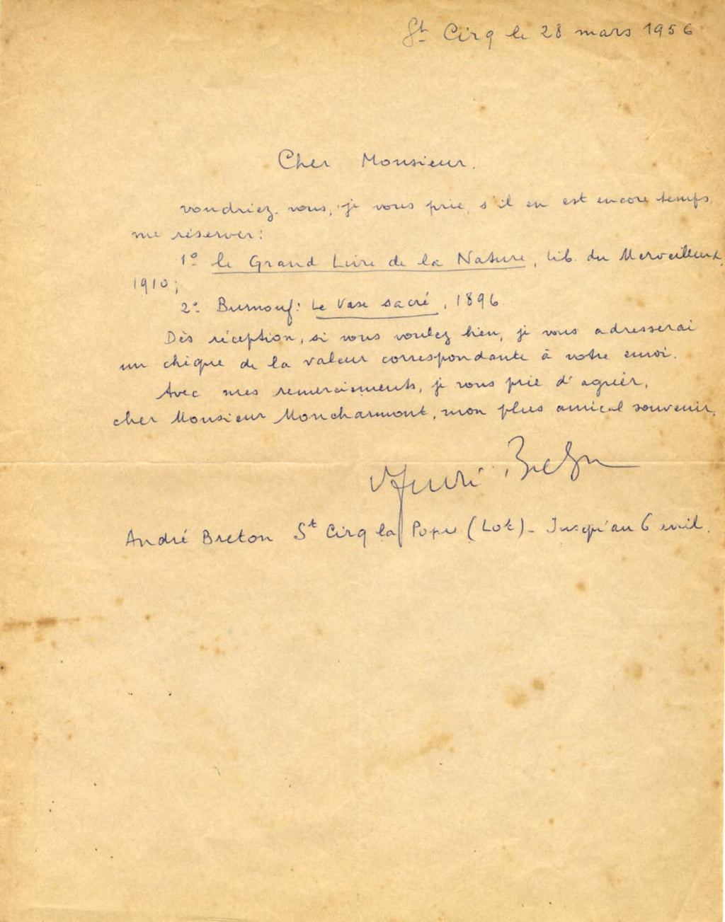 Autograph letter signed, one page, 8,25 x 10,5 inch, Saint-Cirq, 28.03.1956, in French, to the bookseller Moncharmont in Paris - Breton asks his correspondent to reserve two books for him, written and signed in blue ink "André Breton", attractivelly mounted (removable) for fine display with a photograph, shows Breton in a chest-up portrait (altogether 16,5 x 11,75 inch), with browning, soiling to the edges, and mild intersecting letter folds - in nearly fine condition.