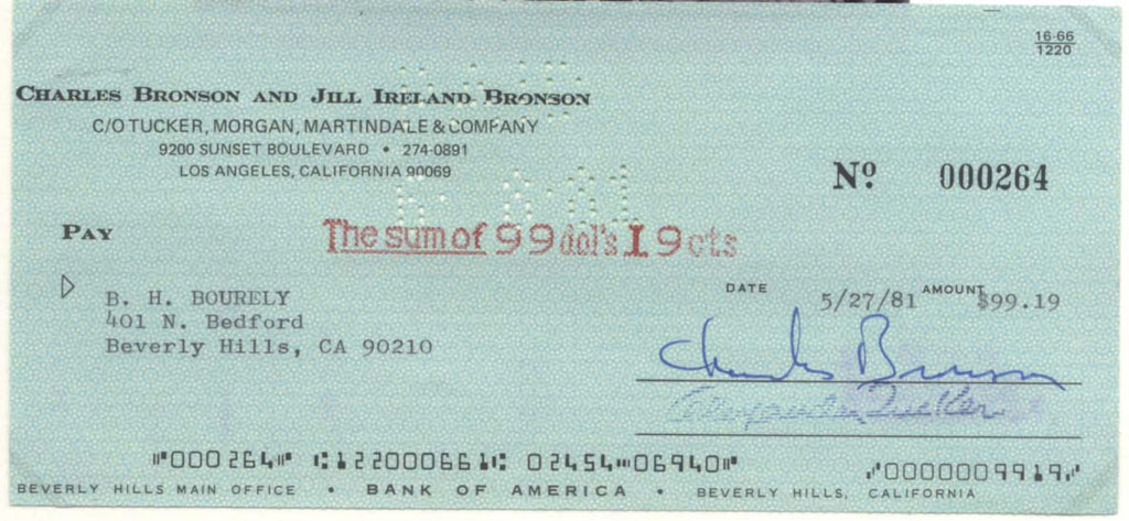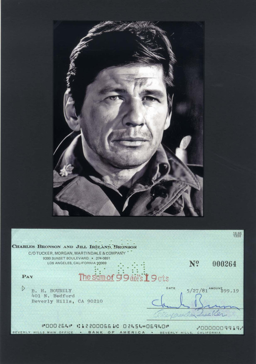 Signed check - `Bank of America`, 7,75 x 3,5 inch, Beverly Hills, 27.05.1981, made out to `B. H. Bourely` - for the amount of 99.19 USD, signed in full in blue ink "Charles Bronson", attractively mounted (removable) for display with a photograph of Charles Bronson in a close-up (altogether 8,25 x 11,75), with bank stamps and scattered very mild signs of wear - in fine to very fine condition.