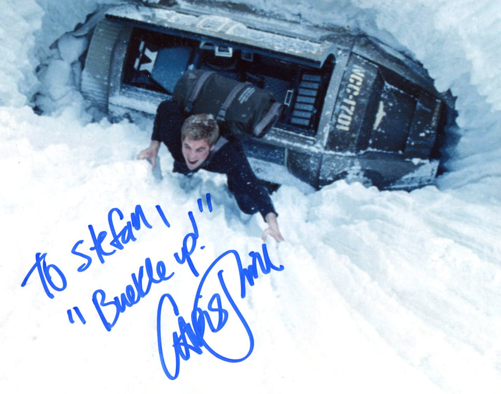 IP signed photograph, shows Chris Pine in a film scene, 10 x 8 inch, signed and inscribed in blue felt tip "To Stefan - "Buekle up!" - Chris Pine", obtained In-Person, in very fine condition.
