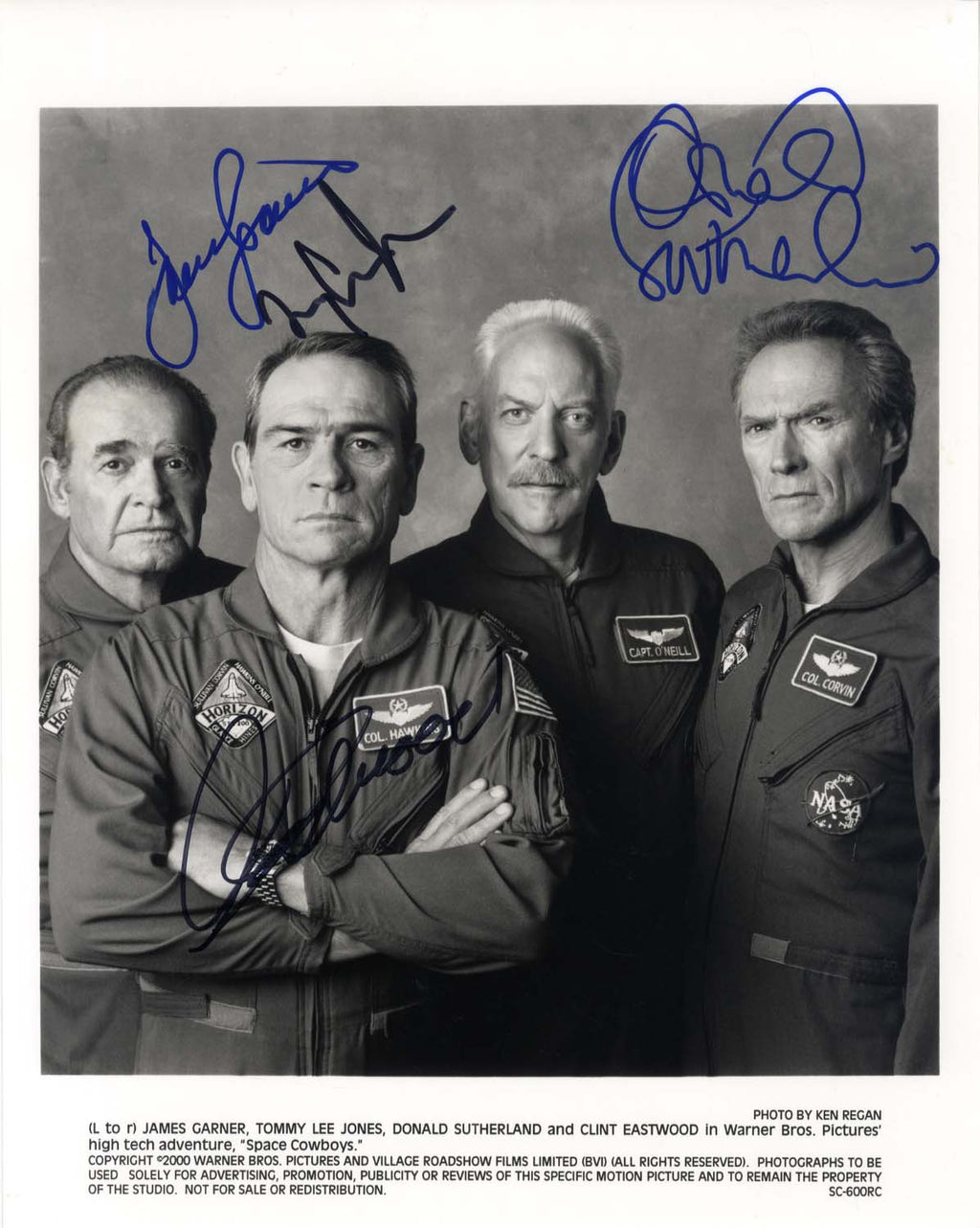 IP signed publicity photograph, shows Clint Eastwood, Donald Sutherland, Tommy Lee Jones, and James Garner in a group picture for the adventure drama film `Space Cowboys` (2000), 8 x 10 inch, obtained In-Person, signed by all four actors & black in blue felt tip, in very fine condition.
