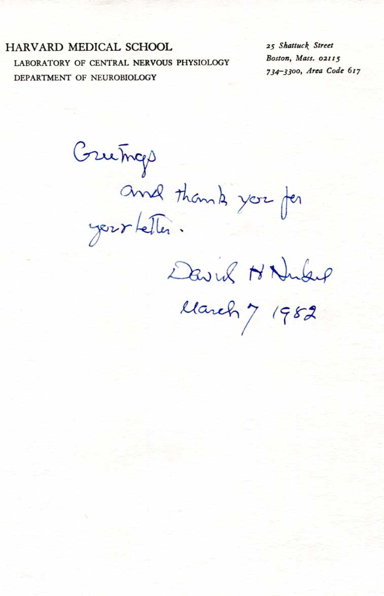 Autograph note signed, one page, 5,5 x 8,5 inch, `Harvard Medical School` stationery, (Boston), 7.03.1982, brief reply letter to an unnamed gentleman, written and signed in blue ink "Greetings and thank you for your letter. - David H. Hubel - March 7 1982", in very fine condition.