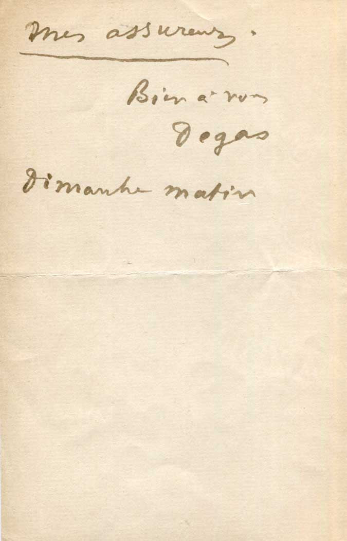 Autograph letter signed, 1 1/3 pages (both sides), 4,5 x 7 inch, Sunday morning, in French, to Paul Durand-Ruel* - concerning a fire in his atelier, written and signed in dark ink "Degas", attractively mounted (removable) for fine display with a portrait picture of Edgar Degas (altogether 11,75 x 8,25 inch), with a central horizontal letter fold and mild browning to the edges - in fine to very fine condition.