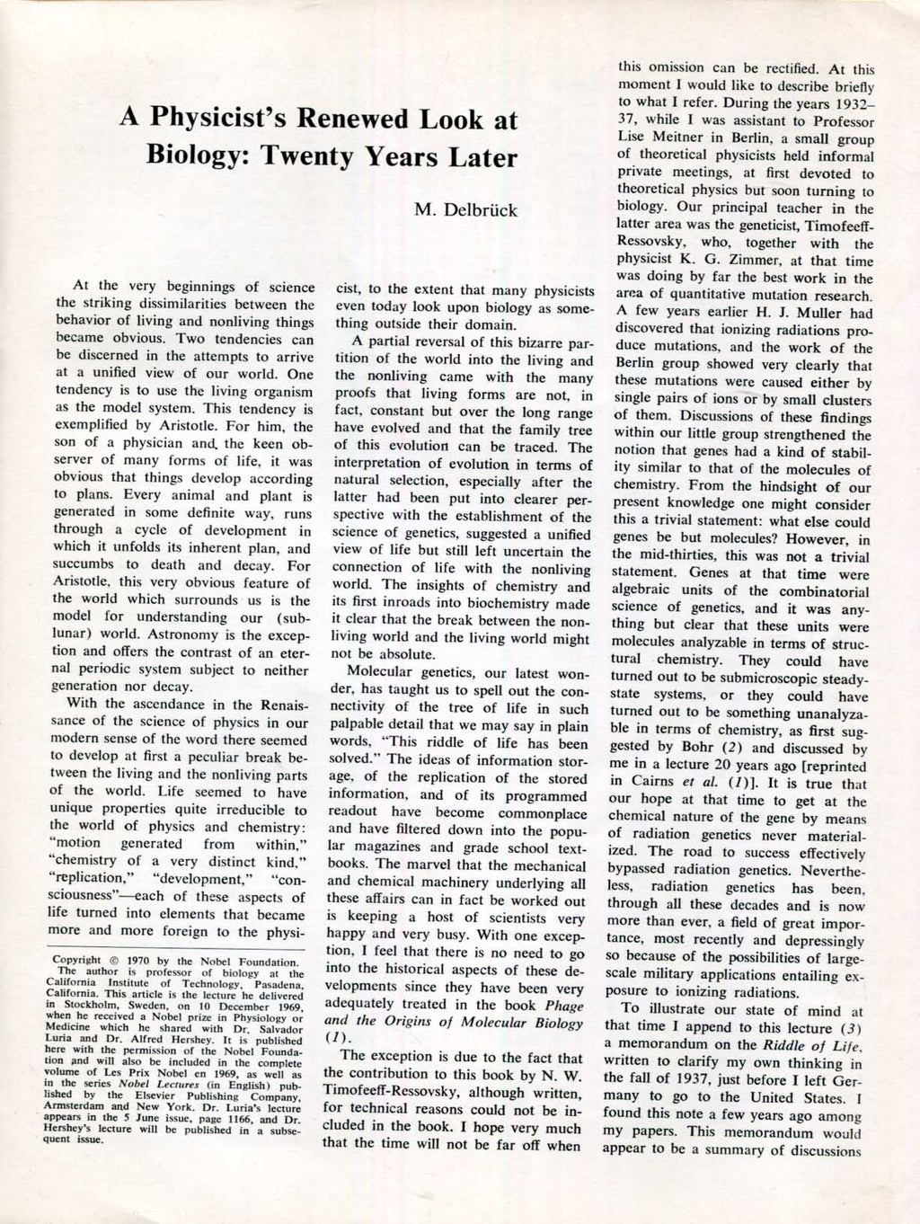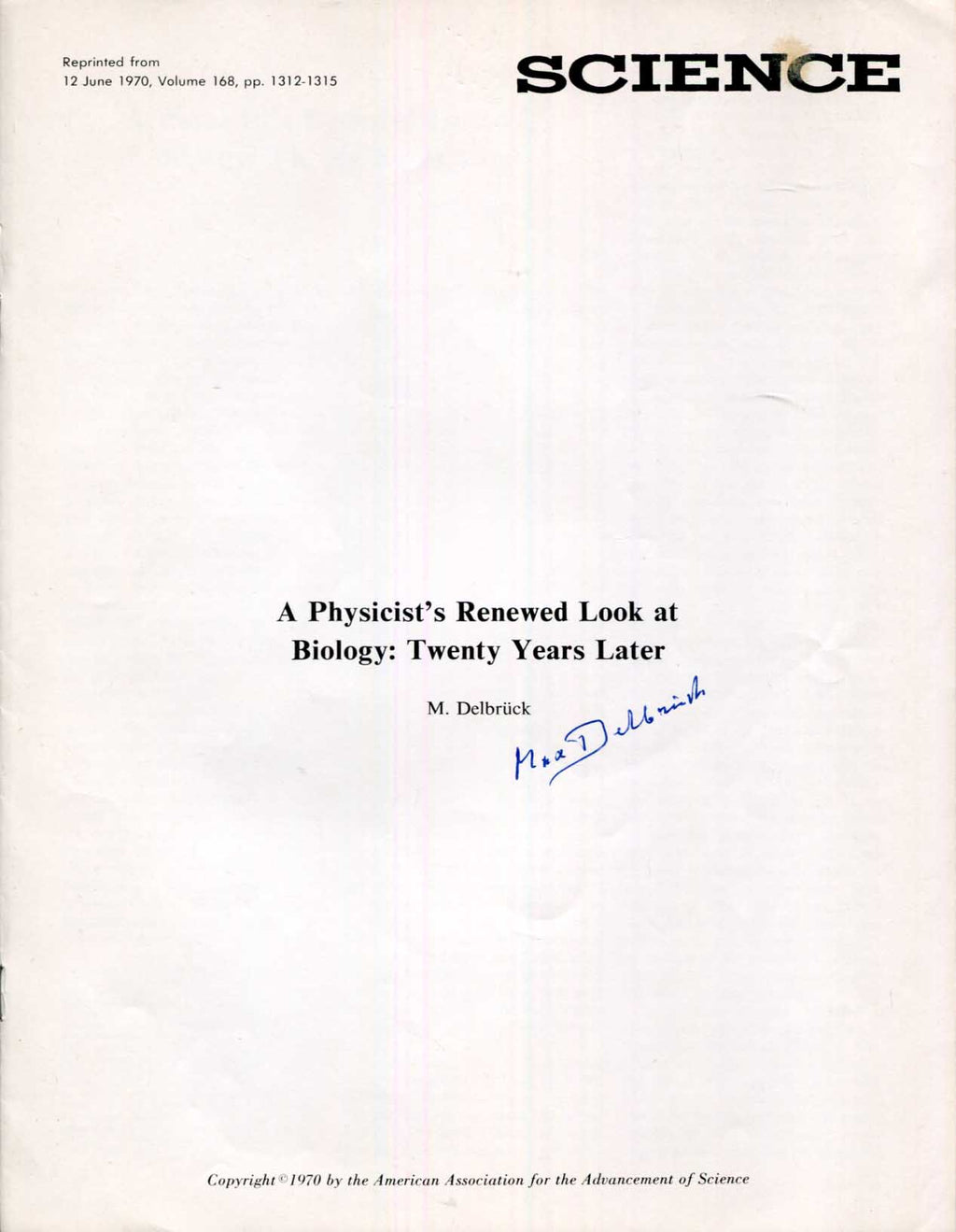Printed scientific article signed, four pages (stapled together), 8,5 x 11 inch, scientific article entitled `A Physicist`s Renewed Look at Biology: Twenty Years Later` by M. Delbrück - reprint from `Science` (June 12, 1970, Vol. 168), signed in blue ink "Max Delbrück", with mild signs of wear - in fine to very fine condition.