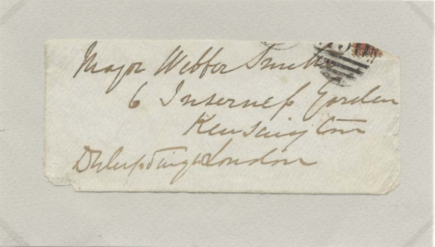 Autograph envelope clipping signed, about 4,75 x 2 inch - affixed on a slightly larger card, London, "Major Webber Smith - [...] Kensington", written and signed in black ink "Duleep Singh - London", attractively mounted (removable) for fine display with picture, shows Duleep Singh in a 2/3 length pose (altogether 8,25 x 11,75 inch), with irregularly trimmed edges, and mild soiling - in fine to good condition.