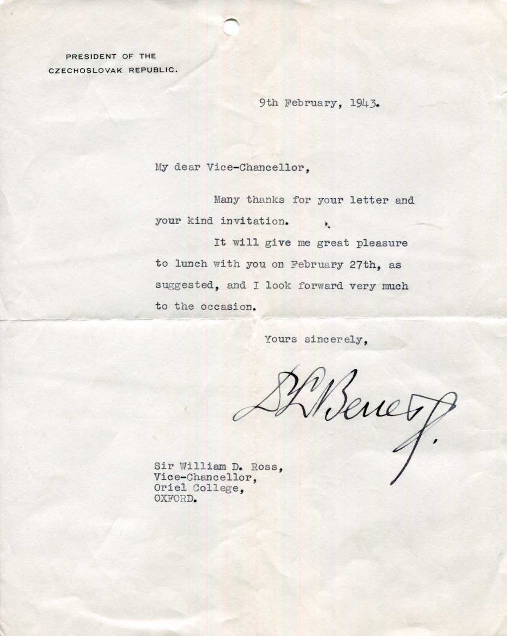 Typed letter signed, one pages, 8 x 10 inch, `President of the Czechoslovak Republic` letterhead, (London), 9.02.1943, reply letter to Sir W. D. Ross (1877-1971, Scottish Aristotelian philosopher, translator, WWI veteran, civil servant, and university Administrator) - concerning an invitation, signed as President in blue ink "Dr E. Benes", with intersecting letter folds and perforated to the upper edge - in fine condition.