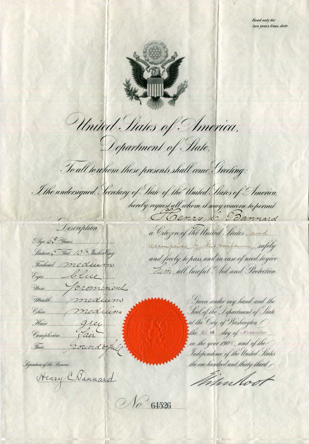 Document signed, one page - with official red blind seal, 11,75 x 16,5 inch, `United States of America, - Department of State` letterhead, Washington, 25.11.1908, numbered `No. 64526`, to Henry Le Bannard and his wife - permission "to pass, and in need to give him all lawful Aid and Protection", signed in blue ink "Elihu Root" - also signed by Henry Le Bannard, with intersecting letter folds - in fine to very fine condition.
