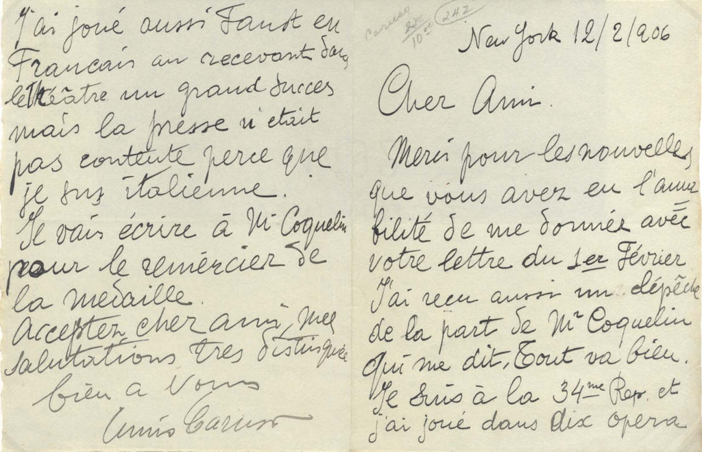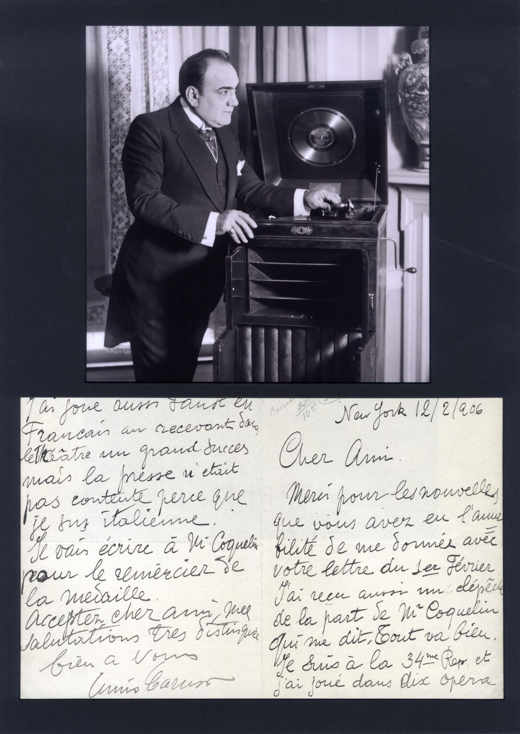 Autograph letter signed, two pages (on two conjoined sheets), 5,5 x 7,25 inch, New York, 12.02.1906, in French, reply letter to "Cher ami" - Caruso writes about his performances* and Mr. Coquelin**, written and signed in dark ink "Enrico Caruso", attractively mounted (removable) for display with a photograph of Enrico Caruso (altogether 11,75 x 16,5 inch), with scattered mild signs of wear - in fine to very fine condition.
