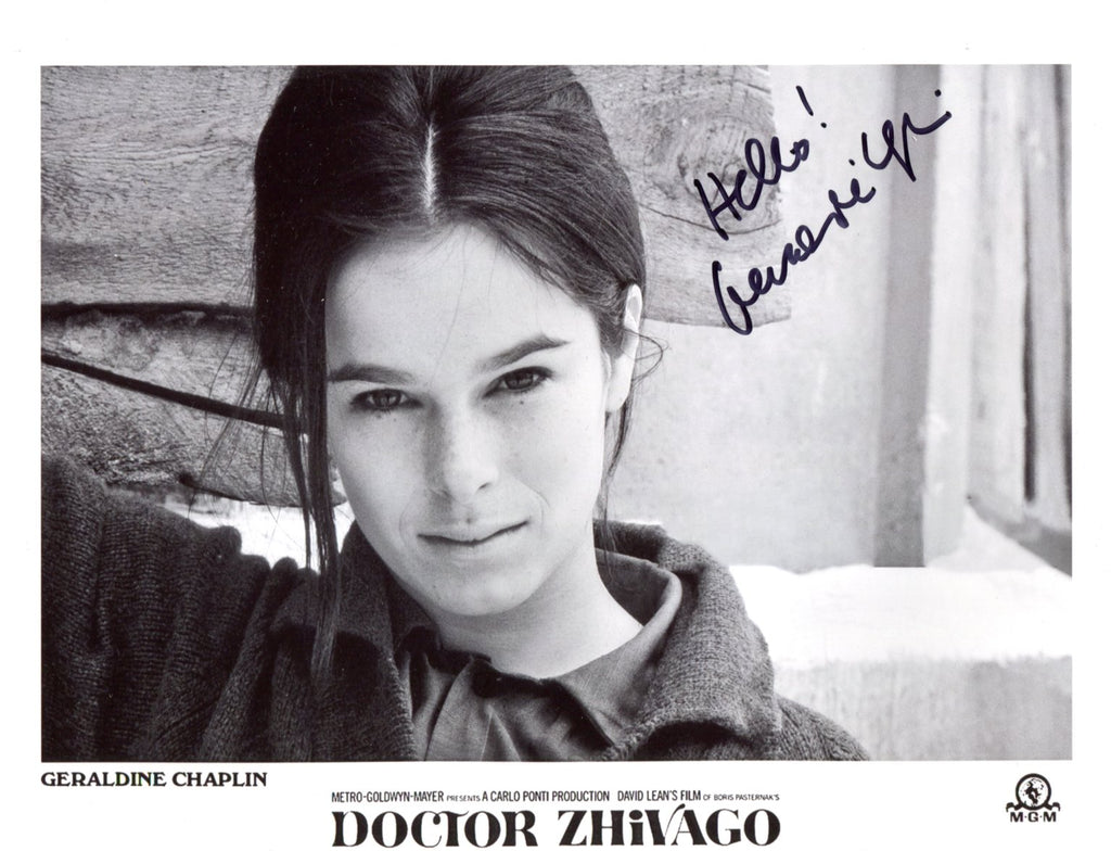 Signed publicity photograph, shows Geraldine Chaplin as Tonya Gromeko in `Doctor Zhivago`, 10,25 x 8 inch, signed and inscribed in black felt tip "Hello! - Geraldine Chaplin", in very fine condition.