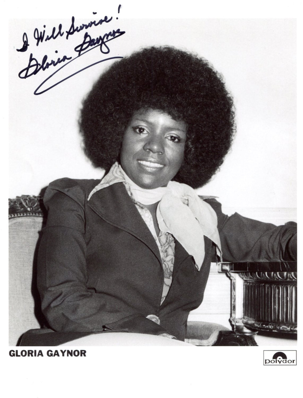 Signed publicity photograph, shows Gloria Gaynor in a beautiful half length pose, 8 x 10,25 inch, signed and inscribed in black felt tip "We will survive! - Gloria Gaynor", in very fine condition.