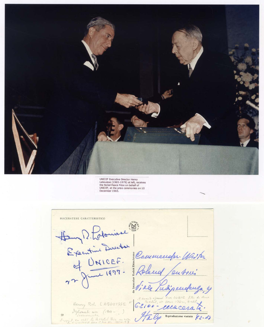 Signed postcard (Valle del Pozenza - front), 5,75 x 4 inch, signed and inscribed in blue ballpoint ink "Henry R. Labouisse - Executive Director of UNICEF. - 22 June 1977" - also addressed by an unknown hand and inscribed by the collector (pencil), with a small area of surface abrasion (front) and scattered mild signs of wear - in fine condition.
