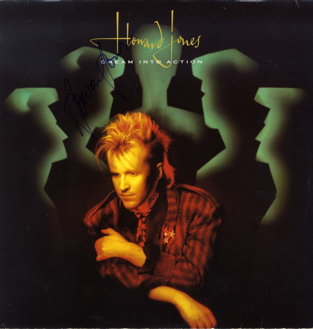 Signed vinyl record cover `Howard Jones - Dream Into Action`, 12,25 x 12,25 inch, signed on the front cover in blue felt tip "Howard Jones", with mild signs of wear to the edges - in fine to very fine condition. Accompanied by the vinyl record.