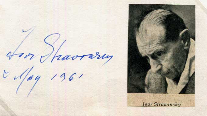 Signed album page (with an affixed magazine picture), 4,5 x 2,75 inch, signed and dated in blue ink "Igor Stravinsky - May 1961", attractively mounted (removable) for fine display with a photograph, shows Igor Stravinsky seated at a piano (altogether 8,25 x 11,75 inch), with very mild signs of wear - in nearly very fine condition.