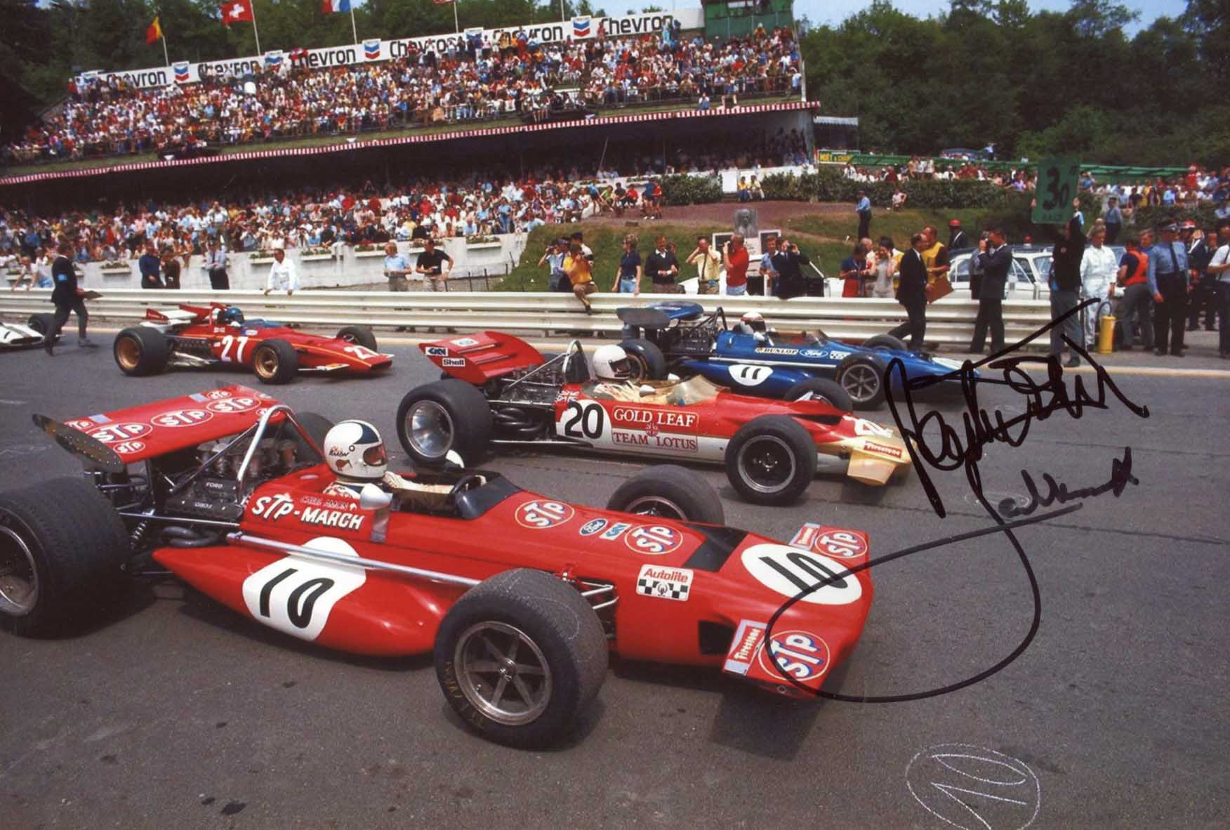 IP signed photograph, shows Jackie Stewart and Jacky Ickx in a racing scene, 12 x 8 inch, obtained In-Person, signed by both in black felt tip, in very fine condition.