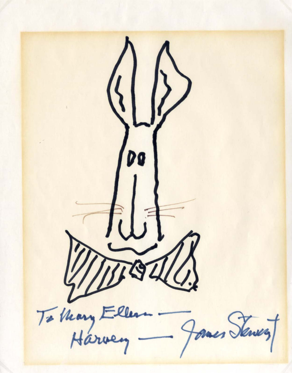 Original handdrawn sketch signed, shows rabbit Harvey - reference to the film `Harvey` (1950), 8 x 10,5 inch, drawn in black felt tip - signed and inscribed in blue felt tip "To Mary Ellesen - Harvey - James Stewart", attractively mounted (removable) for fine display with a photograph, shows Stewart next to Harvey (altogether 16,5 x 11,75 inch), with browning (due to the mount/exhibition) - in fine condition.
