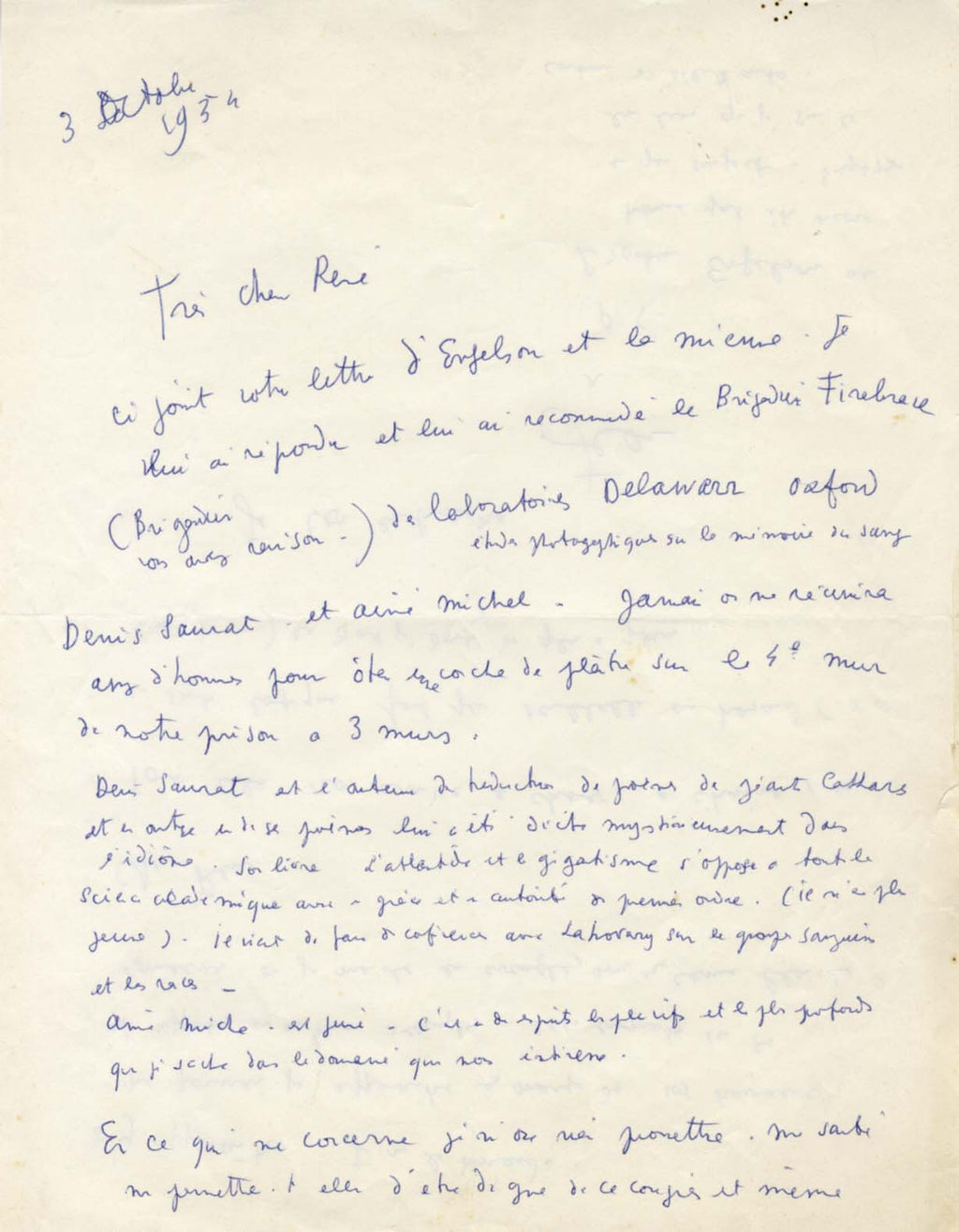 [...] photographic study on the memory of blood [...] We`ll never get enough men together to remove a layer of plaster from the 4th wall of our 3-walled prison. Denis Saurat is the author of translations of poems by [illegible] Cathars and, among other things, one of his poems was mysteriously dictated to him in the idiom. His book: L`Atlantide et le gigantisme opposes all academic science with a grace and authority of the highest order. (He`s not young anymore). He has just lectured with Lahovary on blood groups and races [...]"