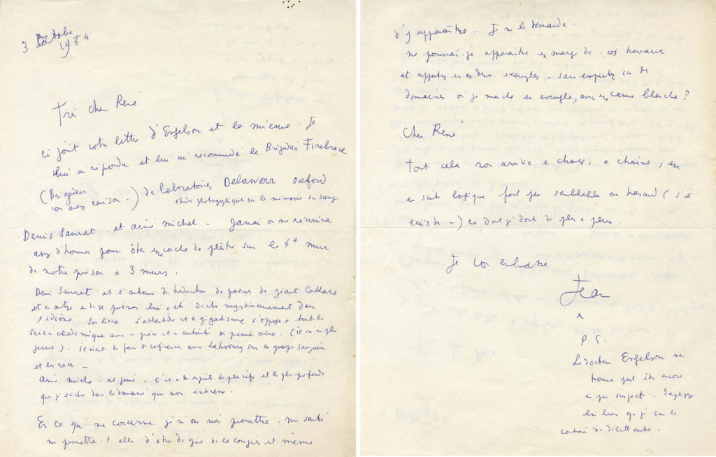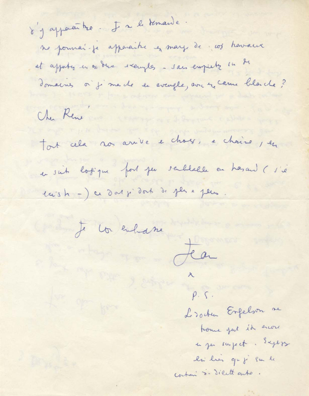 Autograph letter signed, two pages (both sides), 8 x 10,5 inch, in French, 3.10.1954, to his friend the Egyptologist René Bertrand - concerning a photographic study on the memory of blood, Denis Saurat*, and his state of health, written and signed in blue ink "Jean", with letter folds, one small tear to an edge (text unaffected), and mild signs of wear - in fine condition.