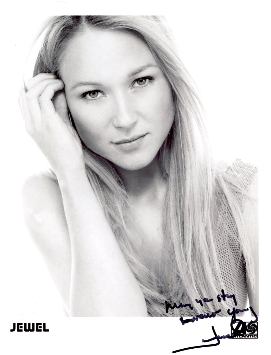 Signed publicity photograph, shows Jewel in a beautiful head and sholders portrait, 8 x 10,25 inch, signed and inscribed in black felt tip "May you stay forever young - Jewel", in very fine condition.