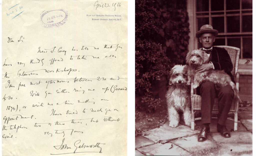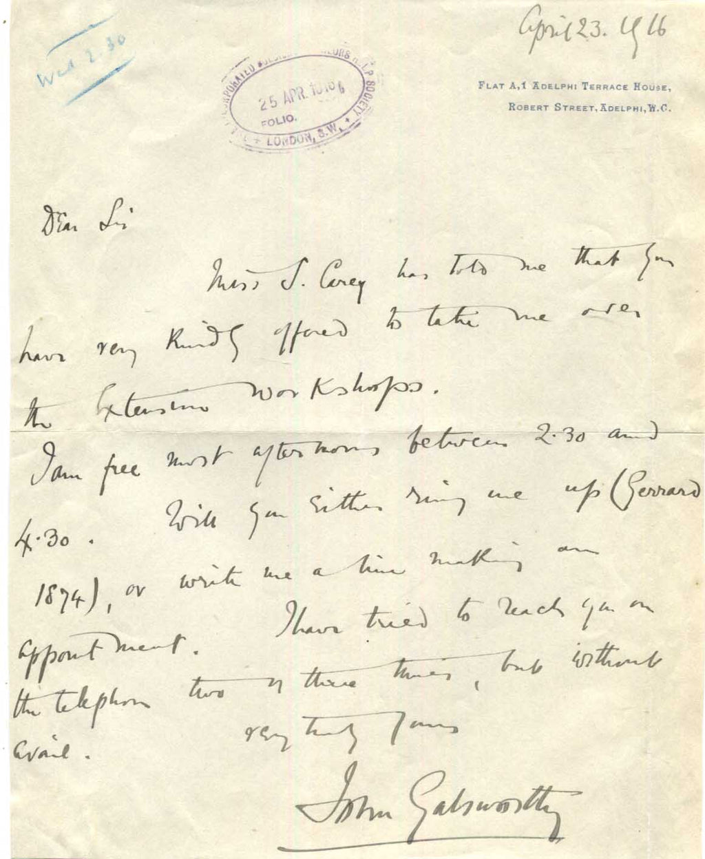 Autograph letter signed, one page, 7,5 x 9,5 inch, `Flat A, 1 Adelphi Terrace House` stationery, 23.04.1916, to "Dear Sir" - concerning an appointment, written and signed in dark ink "John Galsworthy", with slightly trimmed edges, intersecting letter folds, and small glue remnants verso - in fine condition. Accompanied by an unsigned photograph.
