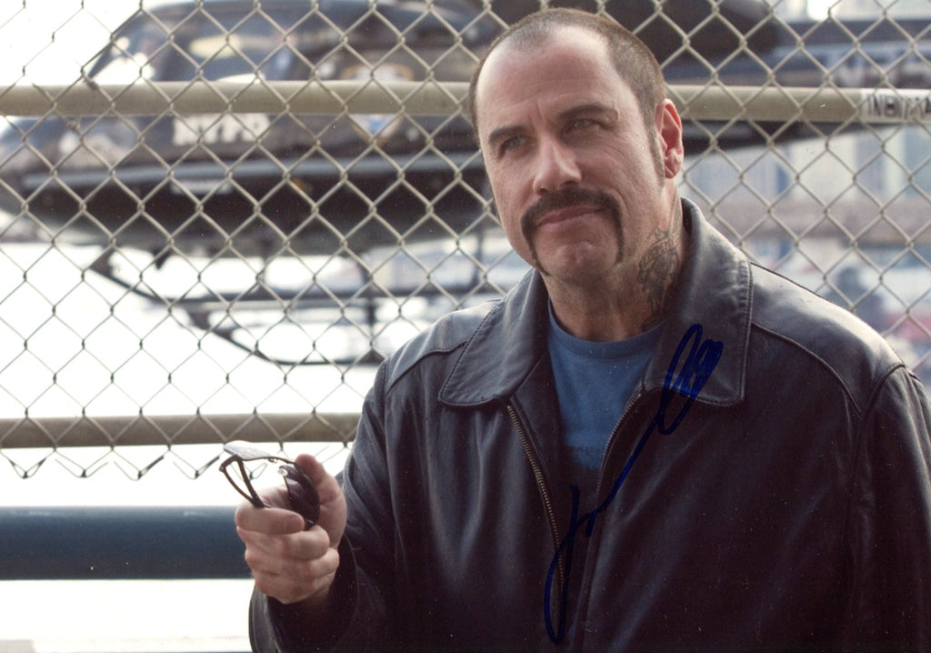IP signed photograph, shows John Travolta in a film scene, 8 x 11 inch, signed in blue felt tip "John Travolta", obtained In-Person, in very fine condition.