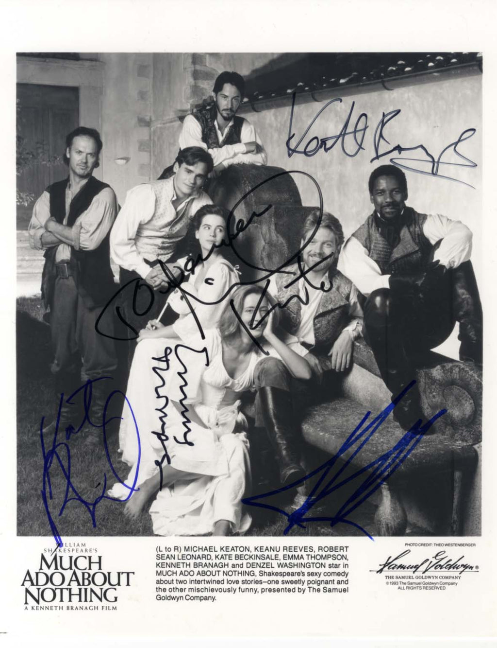 IP signed publicity photograph, shows a group picture for the romantic comedy film `Much Ado About Nothing` (1993), 8 x 10 inch, obtained In-Person, signed by Kenneth Branagh, Michael Keaton, Keanu Reeves, Kate Beckinsale, and Emma Thompson in blue & black felt tip, in very fine condition.